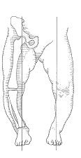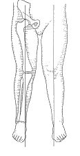 相反的,若立正時,雙膝關節可貼近但雙足踝距離過大,則稱為X型腿(膝外翻)。
